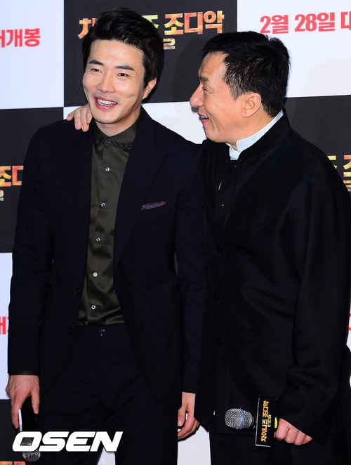 18일 오후 서울 중구 소공동 롯데 에비뉴엘에서 진행된 영화 '차이니즈 조디악' 레드카펫 및 VIP 시사회 행사에서 성룡이 권상우에게 어깨동무를 하며 말을 걸고 있다.