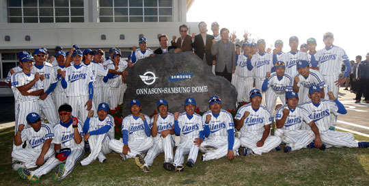 삼성 라이온즈는 18일 전훈캠프 장소인 일본 오키나와현 온나손의 아카마 볼파크에서 실내훈련장 개관식을 가졌다.