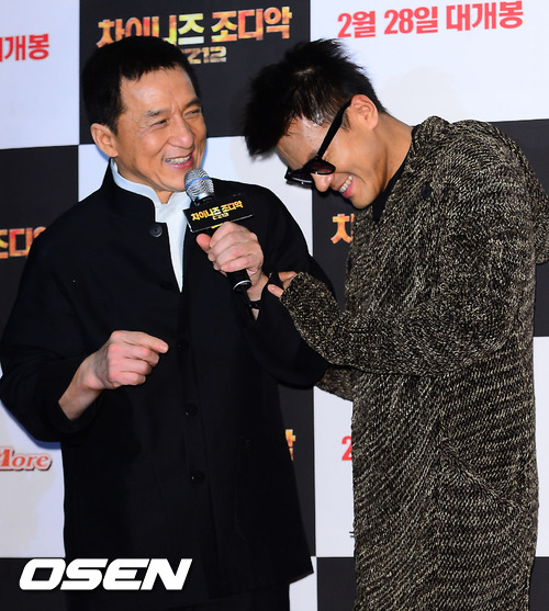 18일 오후 서울 중구 소공동 롯데 에비뉴엘에서 진행된 영화 '차이니즈 조디악' 레드카펫 및 VIP 시사회 행사에서 성룡과 박진영이 즐겁게 얘기를 나누고 있다.