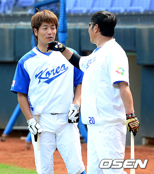 문제는 야수들의 숫자가 맞지 않는다는 점. 이번 대표팀은 포수 2명, 내야수 8명, 외야수 5명으로 이뤄져 있다. 당연히 각 팀에서 빈 포지션이 나올 수밖에 없다. 강민호는 자신이 속한 백팀의 좌익수가 없어 수비 때 김현수에게 글러브를 빌려 좌익수 데뷔전을 치렀다.