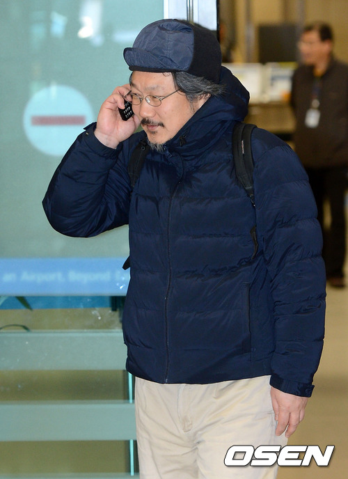 배우 홍상수 감독이 입국장 문을 나가고 있다.