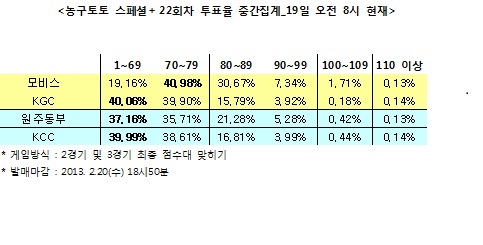 투표율을 살펴보면, 홈팀 모비스는 70점대가 40.98%로 1순위를 차지했고, KGC는 69점 이하가 40.06%로 가장 많이 집계됐다.