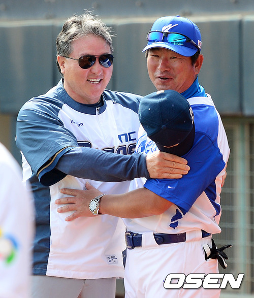NC와의 연습경기에 앞서 김경문 감독과 대표팀 류중일 감독이 인사를 나누고 있다.