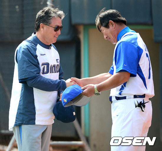 NC와의 연습경기에 앞서 김경문 감독과 대표팀 류중일 감독이 인사를 나누고 있다.
