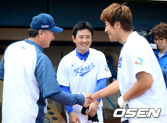NC와의 연습경기에 앞서 김경문 감독과 대표팀 강민호가 인사를 나누고 있다.