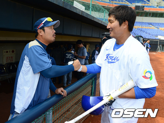 NC와의 연습경기에 앞서 이호준과 대표팀 이진영이 인사를 나누며 이호준이 이진영의 머리가 작아졌다며 장난을 치고 있다.