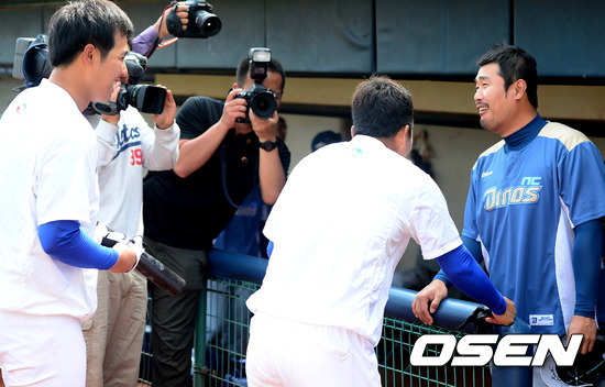 NC와의 연습경기에 앞서 이호준과 대표팀 최정, 정근우가 인사를 나누고 있다.