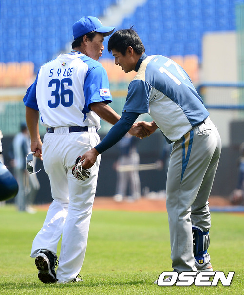 NC와의 연습경기에 앞서 대표팀 이승엽과 NC 조영훈이 인사를 나누고 있다.