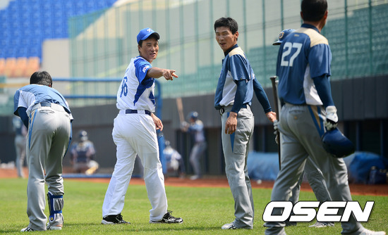 NC와의 연습경기에 앞서 대표팀 이승엽이 NC 조영훈, 김종호, 이호준과 인사를 나누고 있다.