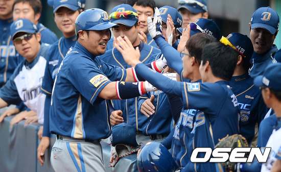 6회초 무사 2루에서 NC 이호준이 1타점 적시타를 날리고 교체되며 더그아웃에서 동료선수들과 하이파이브를 하고 있다. /jpnews@osen.co.kr