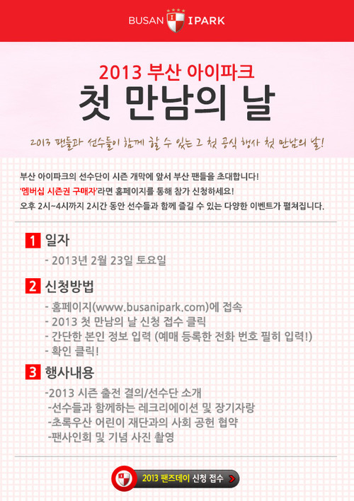 부산 아이파크가 오는 23일 2013 K리그 클래식 개막을 앞두고 '첫 만남의 날 2013' 행사를 가진다.