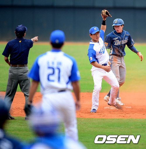 9회말 2사 1루에서 NC 박으뜸이 2루 도루를 시도하였지만 대표팀 손시헌에 태그아웃당하고 있다./jpnews@osen.co.kr