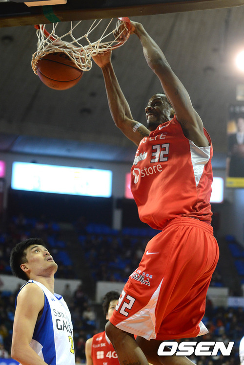 19일 오후 서울 잠실학생체육관에서 열린 'KB 국민카드 2012-2013 프로농구' 서울 SK와 서울 삼성의 경기 4쿼터 헤인즈가 덩크를 하고 있다.