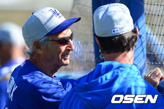 류현진의 라이브 피칭을 지켜보던 샌디 쿠팩스와 매팅리 감독이 이야기를 나누고 있다