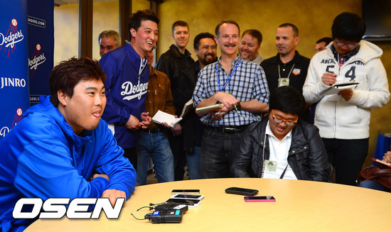 'MLB닷컴' 켄 거닉 기자를 비롯해 'LA타임스' 딜런 에르난데스 기자 등 유력 언론 기자들이 훈련을 마친 뒤 류현진을 찾아나섰다. 다저스 홍보 담당자가 류현진을 찾아 여기저기 분주히 움직였고, 미국 취재진들도 돈 매팅리 감독과 이야기를 나눈 뒤 곧바로 류현진을 보기 위해 클럽하우스로 들이닥쳤다. 공식훈련 뒤 웨이트를 끝내고 라커로 들어온 류현진도 10명이 넘는 취재진의 대거 방문에 깜짝 놀란 눈치였다.