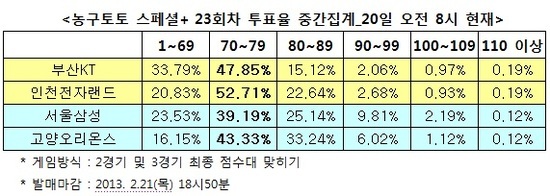 투표율을 살펴보면, 1경기 KT-전자랜드전에서는 각각 47.85%와 52.71%가 양팀이 모두 70~79점대를 기록할 것으로 집계됐다.