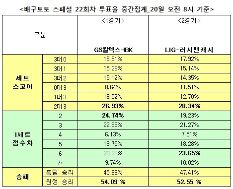 1경기 여자부 경기에서는 2위 GS칼텍스와 1위 IBK가 맞붙는 가운데 IBK 승리(54.09%)가 GS칼텍스 승리(45.89%)보다 앞서며 선두 IBK의 승리를 예상했다. 세트 스코어 예상은 2-3의 IBK 승리(26.93%)가 최다 집계됐다. 1세트 점수차 최다 예상에서는 2점차(24.74%)가 예측됐다.