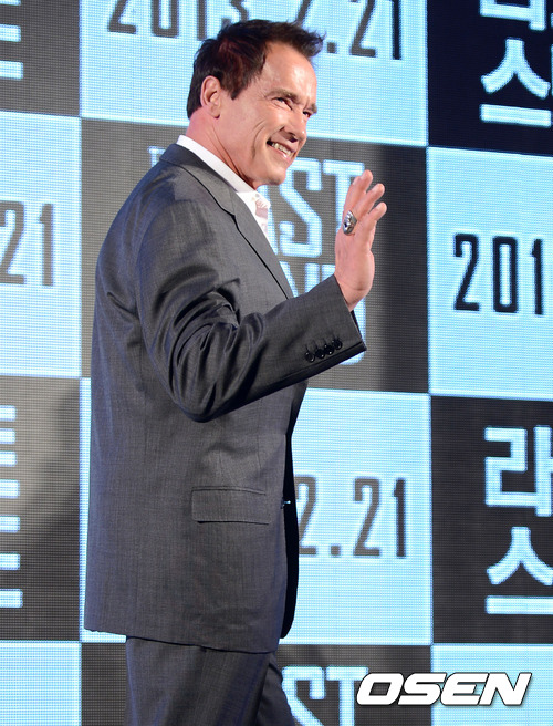 20일 오전 서울 여의도동 콘래드서울호텔 파크볼룸에서 열린 영화 '라스트 스탠드'(감독 김지운) 아놀드 슈왈제네거 방한 기념 기자회견에서 할리우드 배우 아놀드 슈왈제네거가 취재진을 향해 인사를 하고 있다.