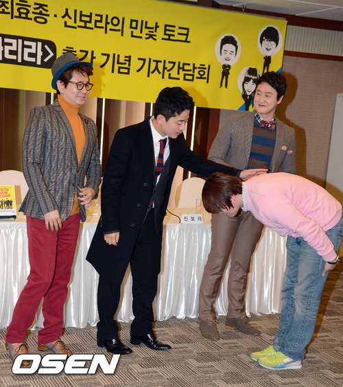 20일 오후 서울 프레스센터에서 진행된 '웃음만이 우리를 구원하리라' 출간 기념 기자간담회에서 최효종이 김준호에게 인사를 하고 있다.