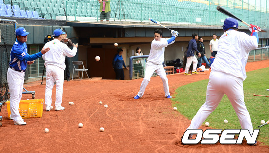 류중일 감독과 박정태 코치가 이승엽, 이대호에 토스를 해주며 배팅훈련을 지도하고 있다.
