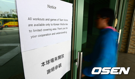 경기장 입구에 한국 취재진을 제외하고 훈련 비공개를 알리는 안내문이 붙여 있다. 안내문에도 불구하고 지난 19일 경기에서 타이완 대표팀측은 몰래 전력분석요원을 들여보내다 적발됐다. 한국야구위원회(KBO) 직원은 심판실에서 초시계를 들고 투수들의 퀵모션 시간을 재던 4명의 타이완 전력분석요원을 적발, 강력 항의한 바 있다.