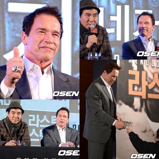 아놀드 슈왈제네거는 20일 오전 10시 30분 서울 여의도 콘래드 호텔에서 열린 영화 ‘라스트 스탠드’(감독 김지운) 기자회견에 김지운 감독과 함께 참석했다. 배우로서는 처음 내한한 아놀드 슈왈제네거를 향한 내외신 기자들의 취재 열기는 뜨거웠다.