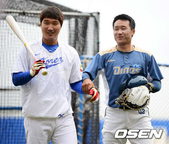 대표팀 이진영과 NC 김태군이 경기에 앞서 훈련을 하며 이야기를 나누고 있다.