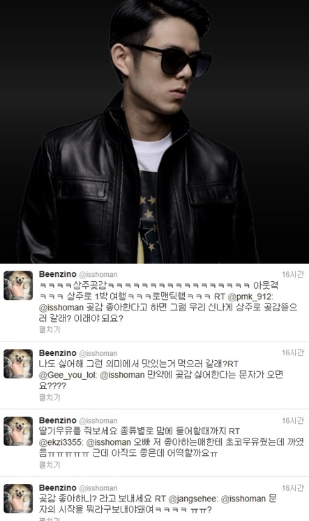 빈지노는 지난 19일 자신의 트위터에 "남자친구는 어떻게 하면 생겨요"라고 물은 여성팬의 질문에 "트위터 하지 말고 맘에 드는 남자한테 지금 당장 문자하세요"라고 답했다.