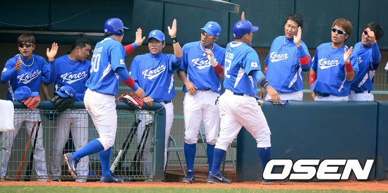 2회초 무사만루에서 대표팀 손아섭의 2타점 적시 2루타에 홈을 밟은 김현수, 김태균이 더그아웃에서 동료선수들과 하이파이브를 하고 있다./jpnews@osen.co.kr