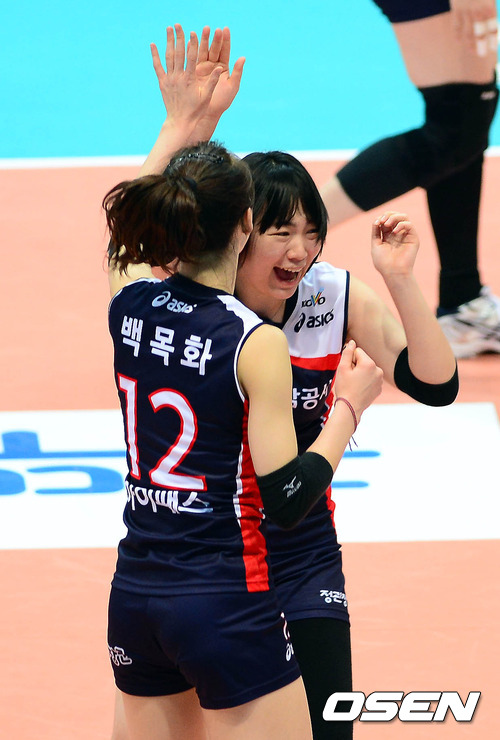20일 오후 인천 도원체육관에서 열린 '2012-2013 NH농협 V-리그' 여자부 흥국생명과 KGC인삼공사의 경기 2세트 백목화와 유미라가 하이파이브를 하고 있다.