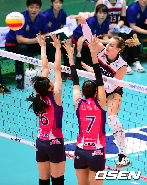 20일 오후 인천 도원체육관에서 열린 '2012-2013 NH농협 V-리그' 여자부 흥국생명과 KGC인삼공사의 경기 2세트 케이티가 공격을 시도하고 있다.