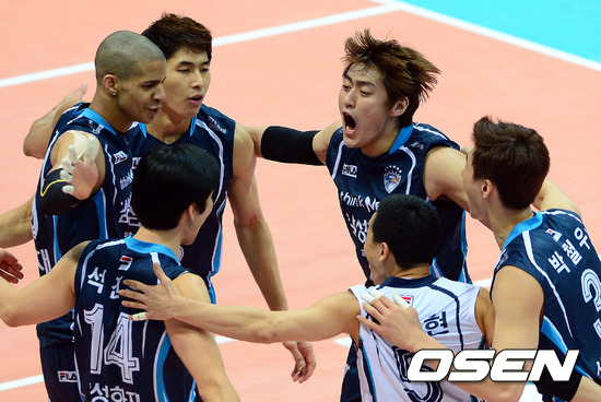 20일 오후 인천 도원체육관에서 열린 '2012-2013 NH농협 V-리그' 남자부 대한항공과 삼성화재의 경기 2세트 삼성화재 선수들이 득점 후 환호하고 있다.