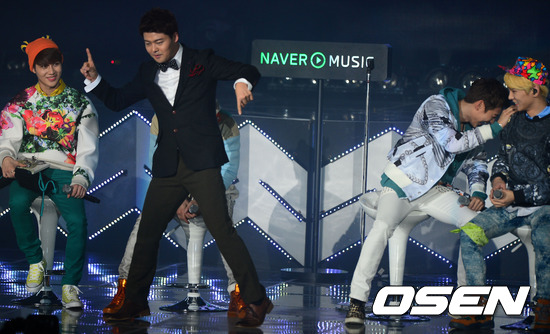 20일 저녁 서울 송파구 방이동 서울 올림픽공원 핸드볼 경기장에서 진행된 샤이니 컴백쇼 ‘드림걸(DREAM GIRL)’에서 전현무가 샤이니 앞에서 샤이니의 루시퍼 댄스를 추고 있다.