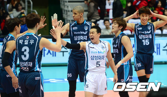 20일 오후 인천 도원체육관에서 열린 '2012-2013 NH농협 V-리그' 남자부 대한항공과 삼성화재의 경기 종료 후 삼성화재 선수들이 승리를 기뻐하고 있다.