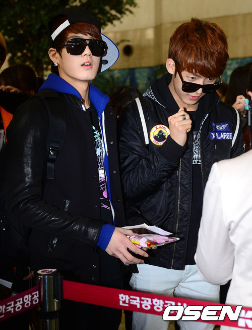 20일 오후 일본 요코하마에서 열리는 '유나이티드 큐브 콘서트' 참석차 출국하는 비투비 프니엘과 민혁이 김포공항 출국장으로 향하고 있다.
