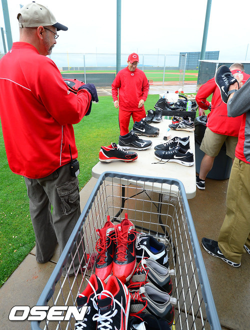 [OSEN=굿이어(미국 애리조나), 곽영래 기자] 20일(현지시간) 비로 인해 엉망이 된 스파이크를 신시내티 레즈 라커 보이들이 능숙하게 닦아내고 있다.