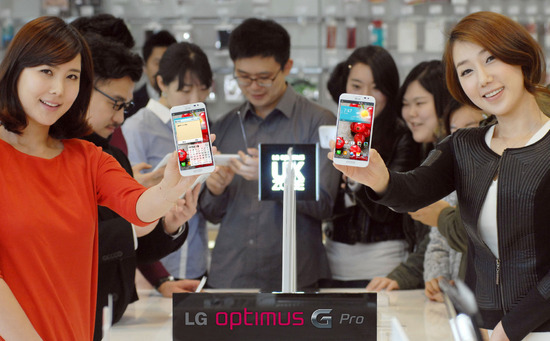 ‘옵티머스 G 프로’가 판매가 21일 시작된 가운데 서울 강남구 청담동 LG베스트샵 강남본점에서 소비자들이 '옵티머스 G Pro'를 시연해 보고 있다.