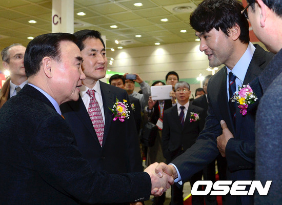 국민체육진흥공단 정정택 이사장과 전 야구선수 박찬호가 악수를 나누고 있다.