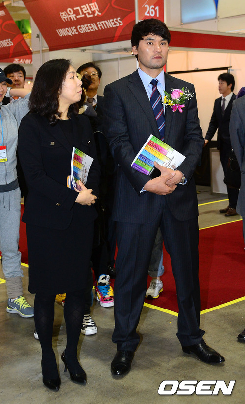 전 야구선수 박찬호가 스포츠용품 설명을 듣고 있다.