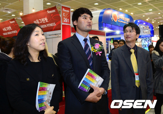 전 야구선수 박찬호가 스포츠용품 설명을 듣고 있다.