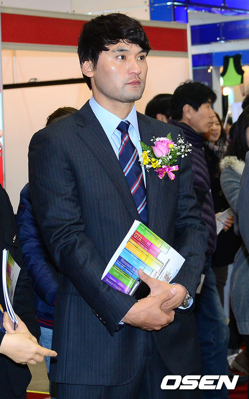 전 야구선수 박찬호가 스포츠용품 설명을 듣고 있다.