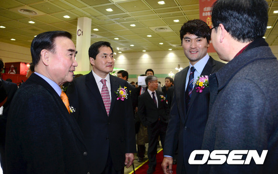 국민체육진흥공단 정정택 이사장과 전 야구선수 박찬호가 이야기를 나누고 있다.