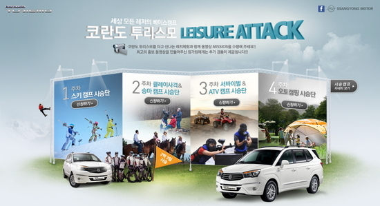 이와 함께 쌍용차는 '코란도 투리스모 레저어택 이벤트'를 펼치고 있다. 이는 2박 3일 동안 코란도 투리스모 시승 기회를 갖고, 레저 체험과 함께 동영상 미션을 수행하는 이벤트로 각 주차 별로 캠프 시승단을 모집해 1주차 스키캠프, 2주차 클레이 사격&승마 캠프, 3주차 서바이벌 & ATV 캠프, 4주차 오토캠핑으로 진행되고 있다.