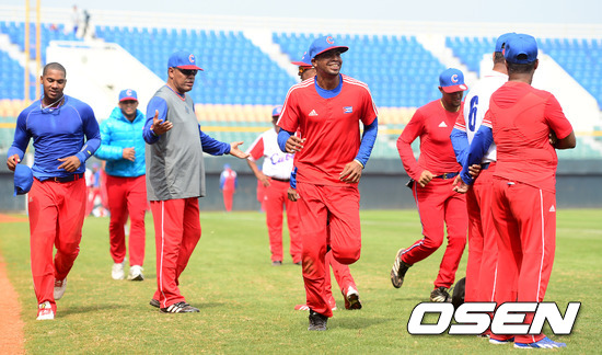 경기 취소뒤 쿠바 대표팀이 그라운드에서 러닝을 하고 있다.