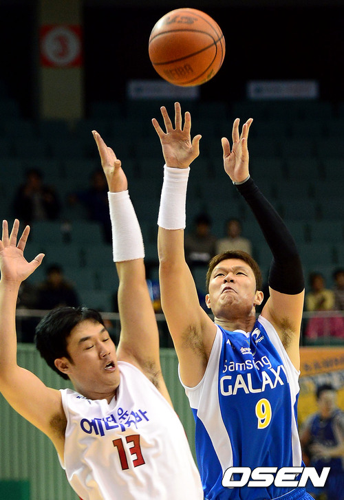 21일 오후 서울 잠실 실내체육관에서 열린 'KB 국민카드 2012-2013 프로농구' 서울 삼성과 고양 오리온스의 경기, 1쿼터 삼성 이규섭이 오리온스 김동욱을 앞에두고 점프슛을 시도하고 있다.