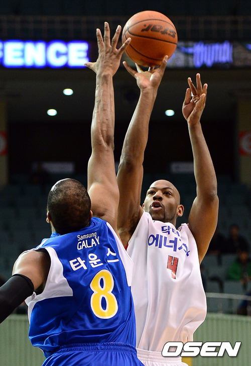 21일 오후 서울 잠실 실내체육관에서 열린 'KB 국민카드 2012-2013 프로농구' 서울 삼성과 고양 오리온스의 경기, 3쿼터 오리온스 윌리엄스가 삼성 타운스를 앞에두고 점프슛을 시도하고 있다.