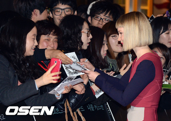 21일 오후 여의도 CGV에서 진행된 영화 '스토커' 레드카페 및 VIP시사회에서 미아 바시코브스카와 팬들에게 사인을 해주고 있다.