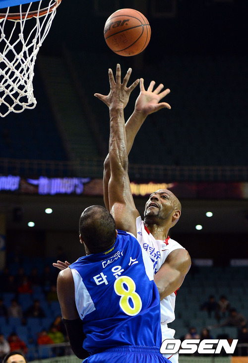 21일 오후 서울 잠실 실내체육관에서 열린 'KB 국민카드 2012-2013 프로농구' 서울 삼성과 고양 오리온스의 경기, 4쿼터 오리온스 윌리엄스가 삼성 타운스를 앞에두고 점프슛을 시도하고 있다.