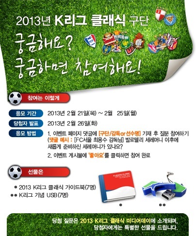 심사를 통해 채택된 질문과 답변은 오는 28일 열리는 ‘2013 K리그 클래식 미디어데이’에서 K리그 감독, 선수들에게 직접 소개될 예정이며 아울러 당첨자들에게는 ▲2013 K리그 오피셜 가이드북(14명) ▲K리그 기념 USB(14명) 등이 경품으로 제공된다.