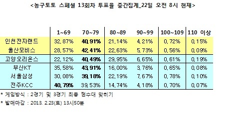국내 프로농구(KBL) 3경기 대상 농구토토 스페셜 13회차 투표율 중간집계 결과